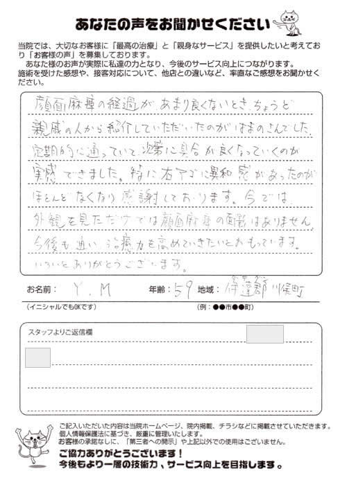 ほとんどなくなりました顔面麻痺の経過があまり良くない時、ちょうど親戚の人から紹介していただいたのが、はまのさんでした。