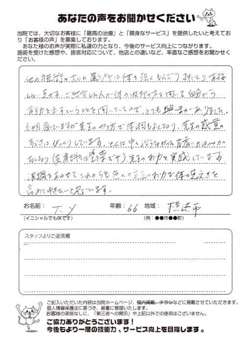 とくに中々治らなかった皮膚のかゆみがなくなり(皮膚科では塗り薬だけ)、先生のお力を実感しています。波長をあわせてこれからも色々と先生のお力で体の免疫を高めてゆきたいと思います。院長のコメント皮膚のかゆみ、うつ症状、体調の改善を希望されて来院されました。
