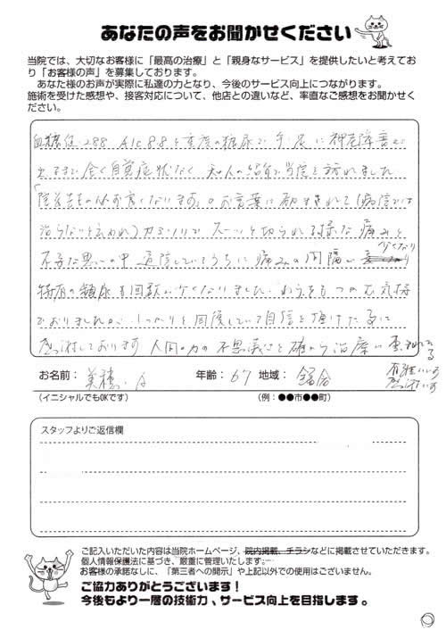 院長先生の「必ず良くなります」のお言葉に励まされて(病院では治らないと言われ)カミソリでスーッと切られる様な痛みと不安な思いの中、通院しているうちに、痛みの間隔が少なくなり、特有の頻尿も回数が少なくなりました。