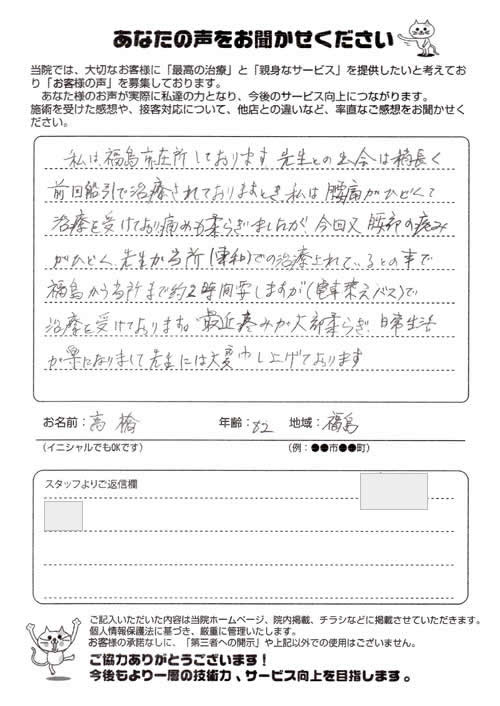 先生との出会いは長く、前回船引で治療されております時、私は腰痛がひとくて治療を受けており、痛みも和らぎましたが、今回又腰部の痛みがひどく、先生から当所(東和)での治療されているとの事で、福島から当所まで約2時間要しますが(電車とバス)で、治療を受けております。